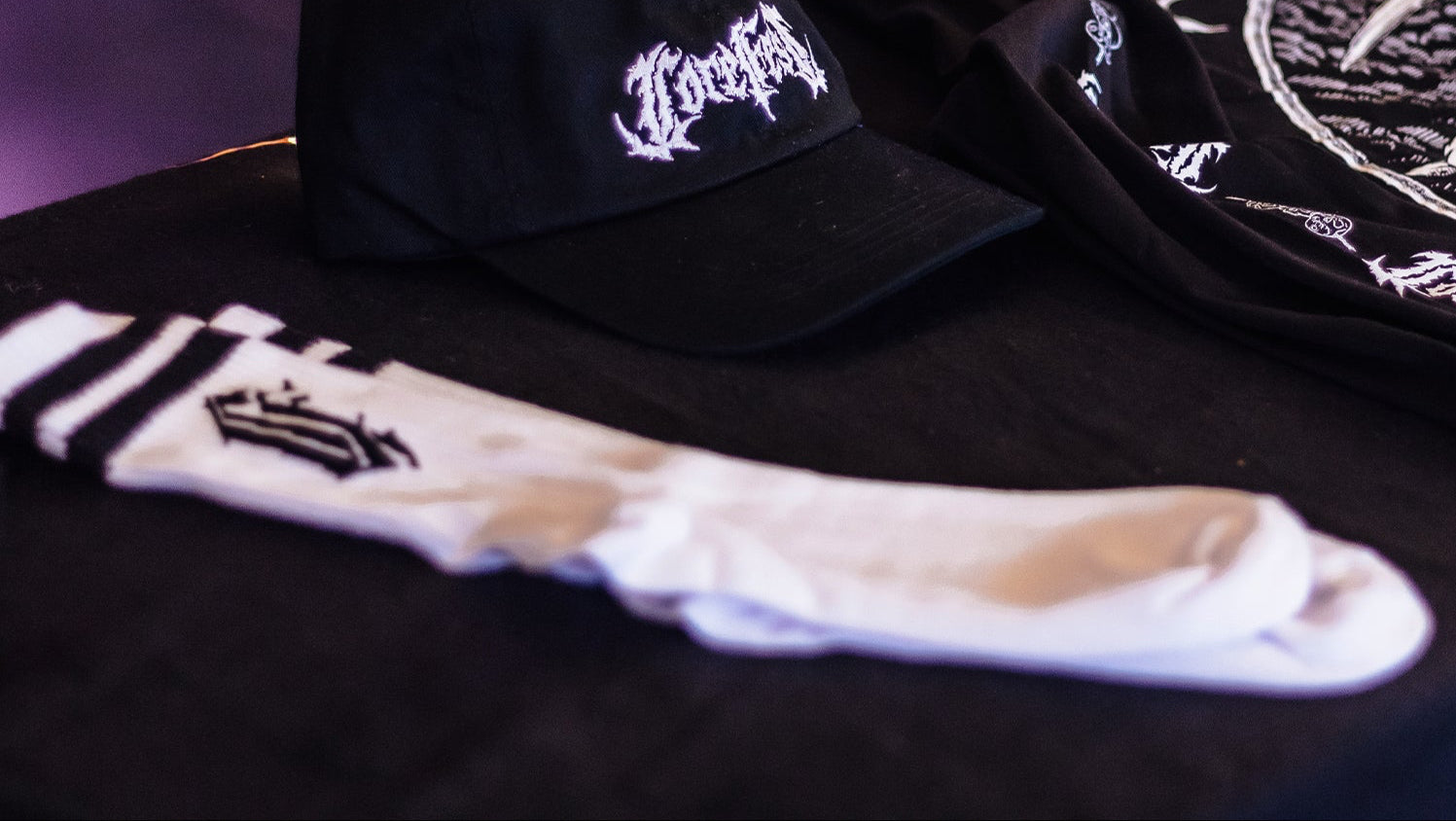 Die Core Fest Skater-Socken. Ein Paar weiße Socken in Einheitsgröße, mit doppeltem schwarzem Rand und CF Schriftzug.